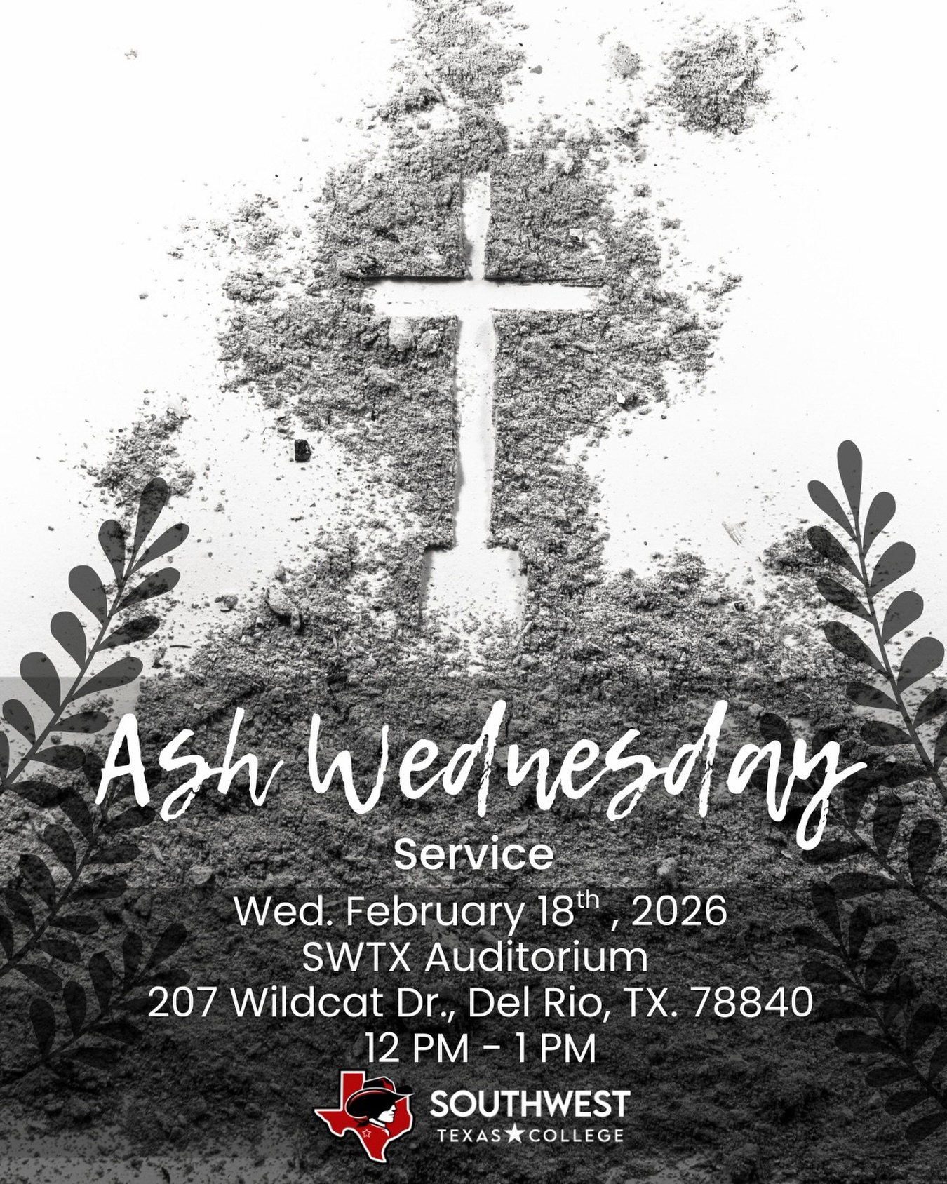 Join the SWTX Catholic Club for our Ash Wednesday Service as we begin the Lenten season in prayer and reflection. Join us on Wednesday, February 18th, at 3:00 pm, in the Matthews Student Center Ballroom.