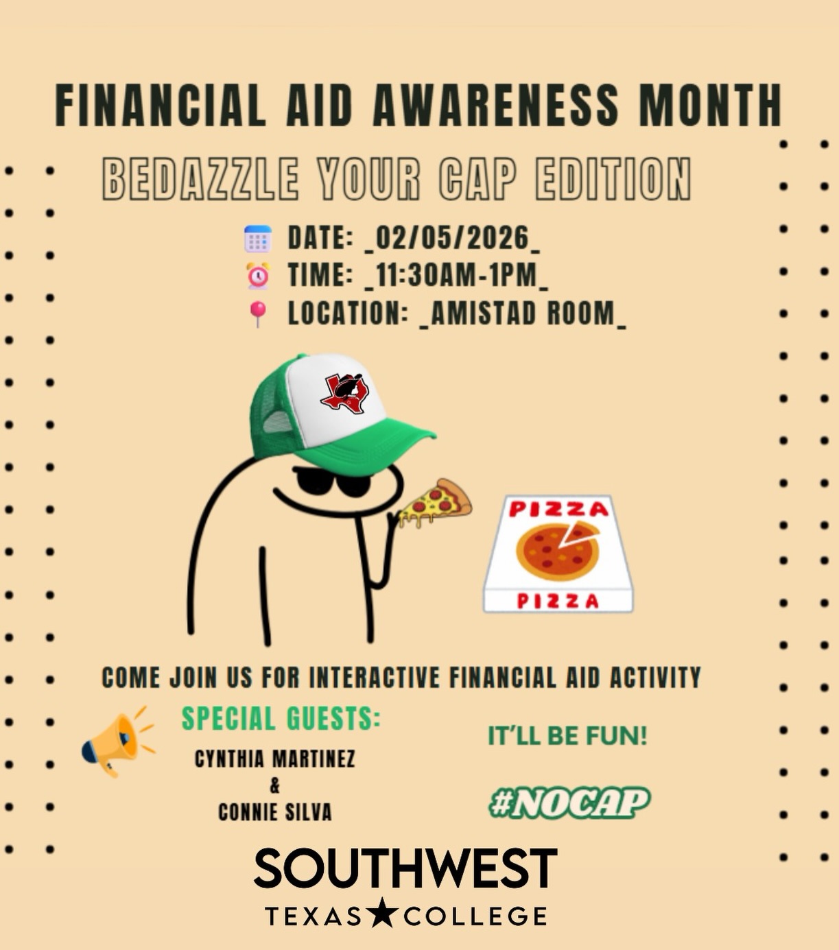 Feb. 5 | Financial Aid Awareness Month: Bedazzle Your Cap Edition with Pizza | Building A, Amistad Room | 11:30 am - 1:00 pm