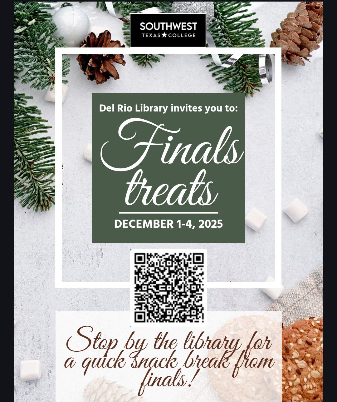 Dec. 4 | Final Exams: Recharge Snack and Study Break | Matthews Student Center Student Lounge | All Day